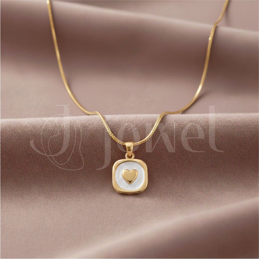 Collier Pendentif Cœur Doré sur Fond Nacre Blanche | Jowel.ma Capturez l'essence de la romance avec notre délicat collier doré. Son pendentif carré, orné d'un fond en nacre et d'un cœur bombé, est un véritable symbole d'affection. Un bijou minimaliste...