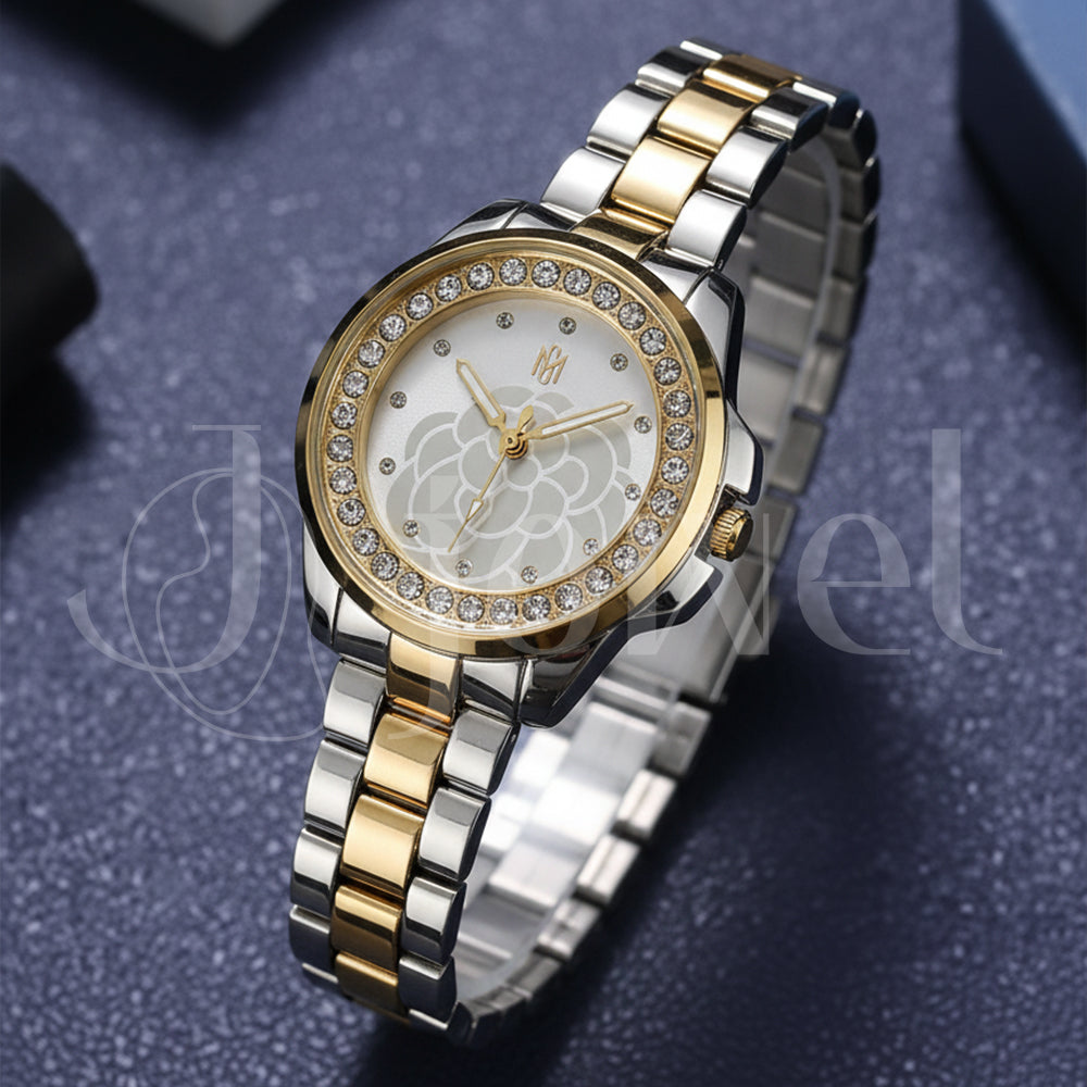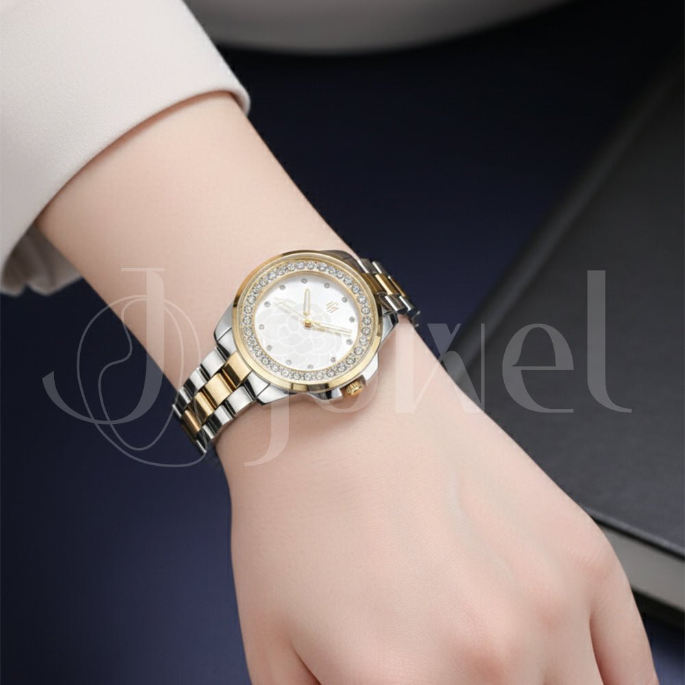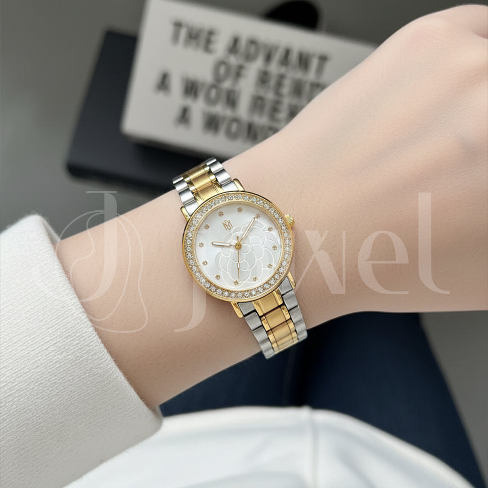 Célébrez la féminité avec notre nouvelle montre pour femme. Son élégant bracelet bimétal mène à un cadran en nacre délicatement gravé d'un motif floral. La lunette, entièrement sertie de cristaux, ajoute une touche d'éclat précieuse. C'est le mariage parfait entre l'horlogerie et le bijou, pour un poignet qui rayonne de grâce et de sophistication. Par Jowel.ma.