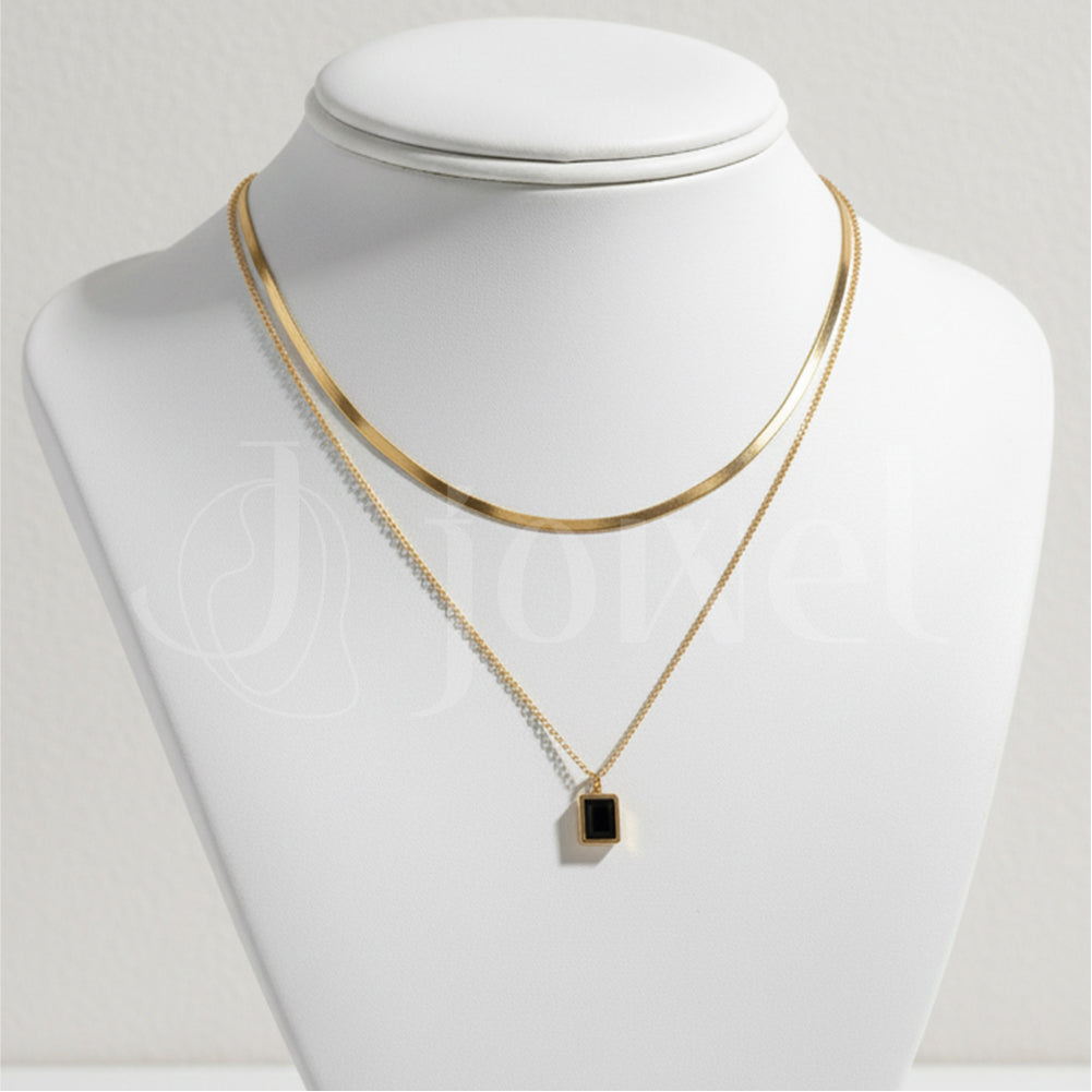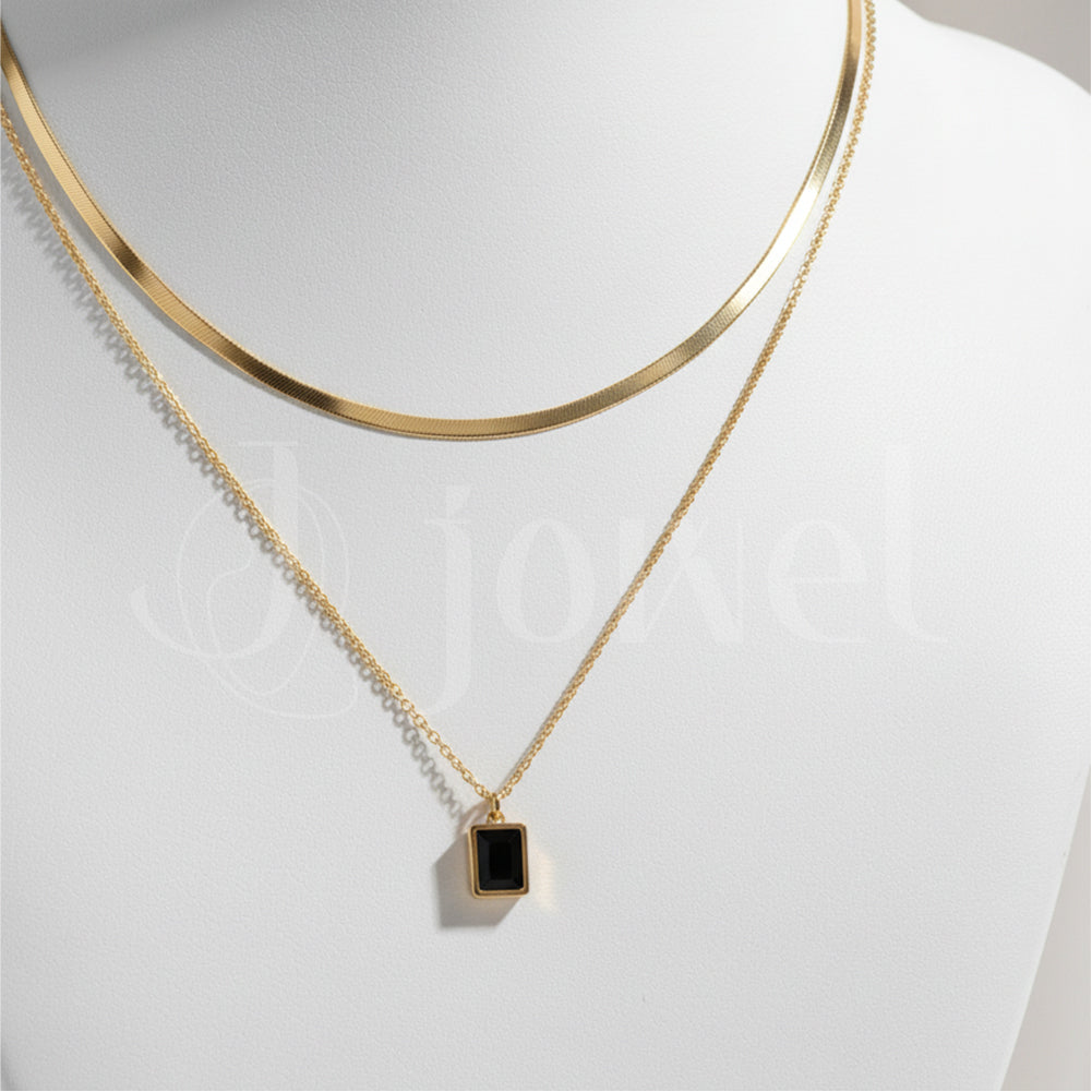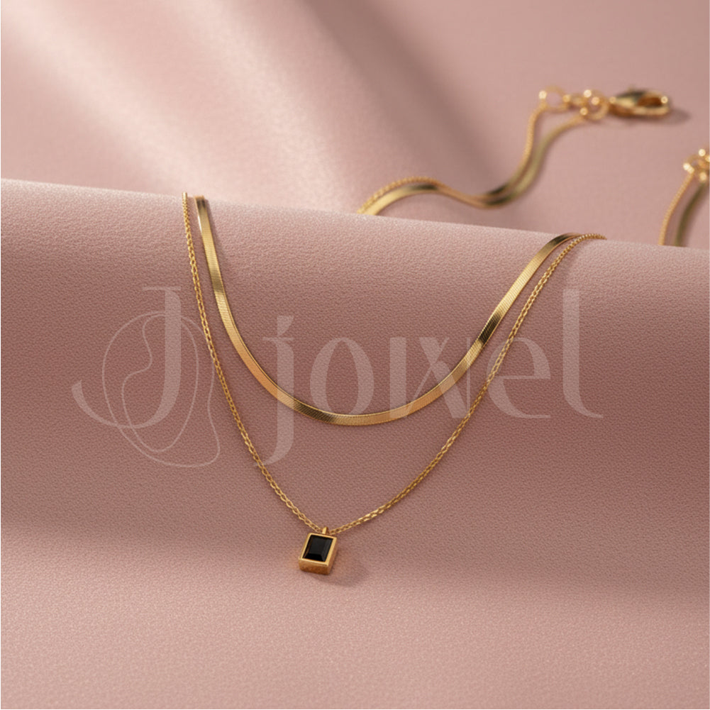 Collier Superposé, Chaîne Serpent et Pierre Noire | Jowel.ma Sublimez votre style avec notre superbe collier doré superposé. Cette pièce élégante combine une chaîne plate maille serpent avec une chaîne délicate ornée d'un pendentif carré en onyx noir. C'est la...