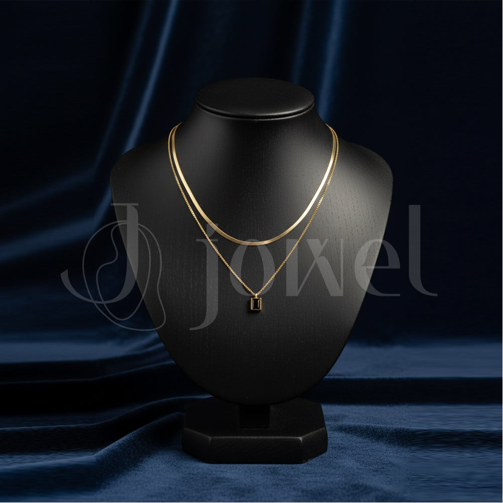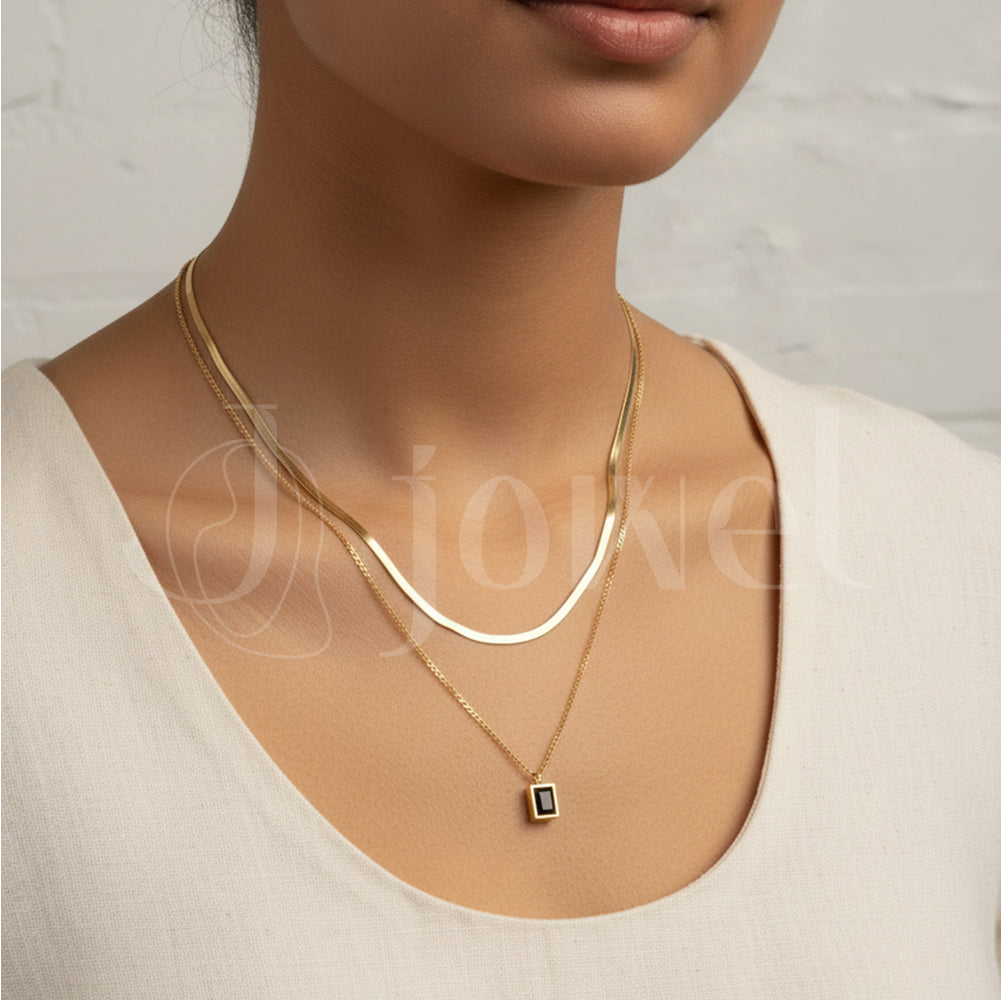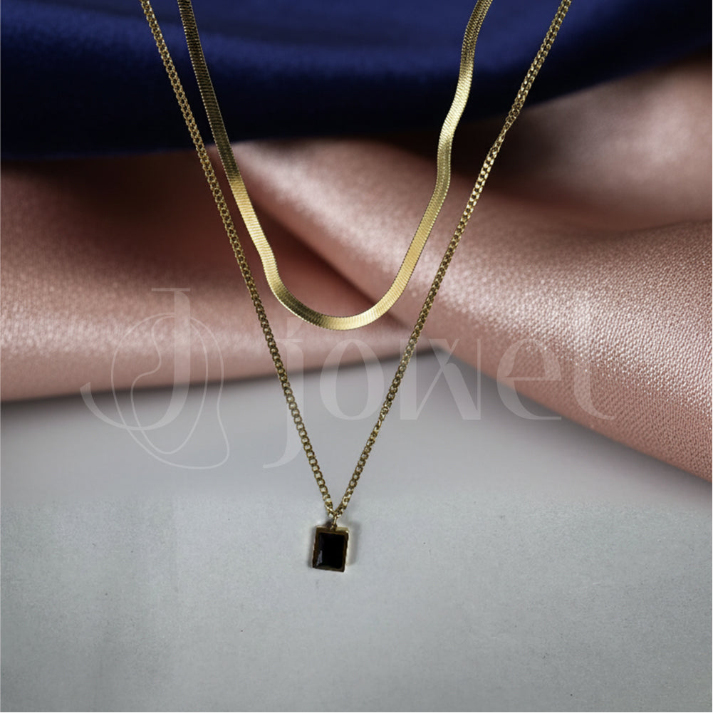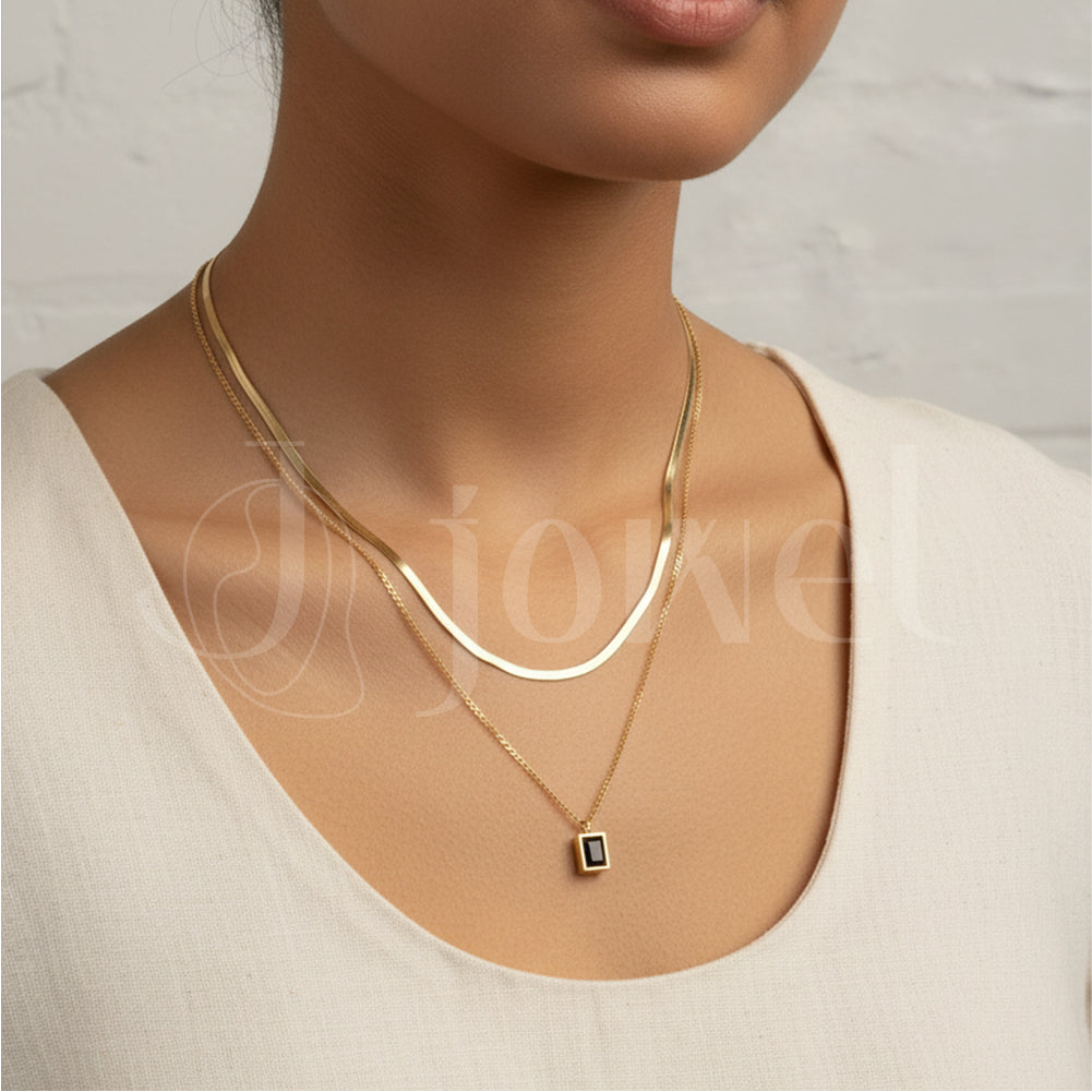 Collier Superposé, Chaîne Serpent et Pierre Noire | Jowel.ma Sublimez votre style avec notre superbe collier doré superposé. Cette pièce élégante combine une chaîne plate maille serpent avec une chaîne délicate ornée d'un pendentif carré en onyx noir. C'est la...