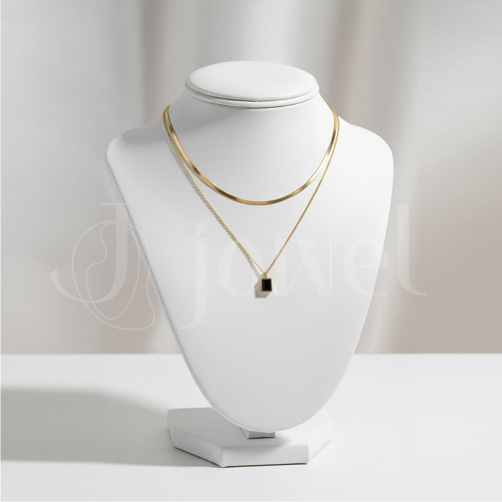 Sublimez votre style avec notre superbe collier doré superposé. Cette pièce élégante combine une chaîne plate maille serpent avec une chaîne délicate ornée d'un pendentif carré en onyx noir. C'est la touche parfaite de sophistication moderne pour toute occasion. Découvrez le luxe minimaliste sur Jowel.ma.