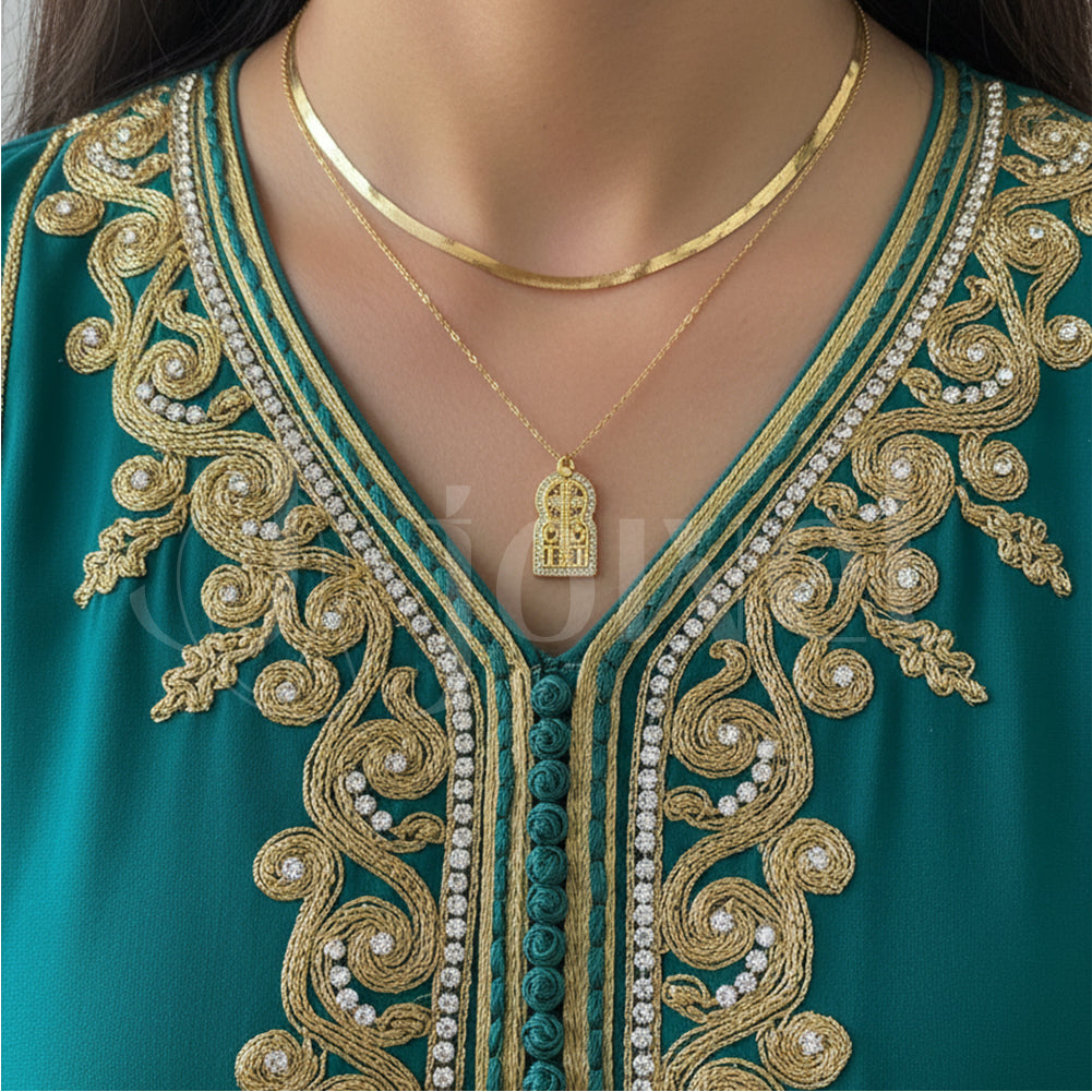 Portez un fragment de l'âme du Maroc avec notre collier exceptionnel. Ce pendentif doré, finement ciselé et pavé de cristaux scintillants, recrée la beauté d'une porte traditionnelle de la médina de Fès. C'est un hommage à notre héritage et à l'artisanat marocain. Un bijou qui porte en lui une histoire, signé Jowel.ma.