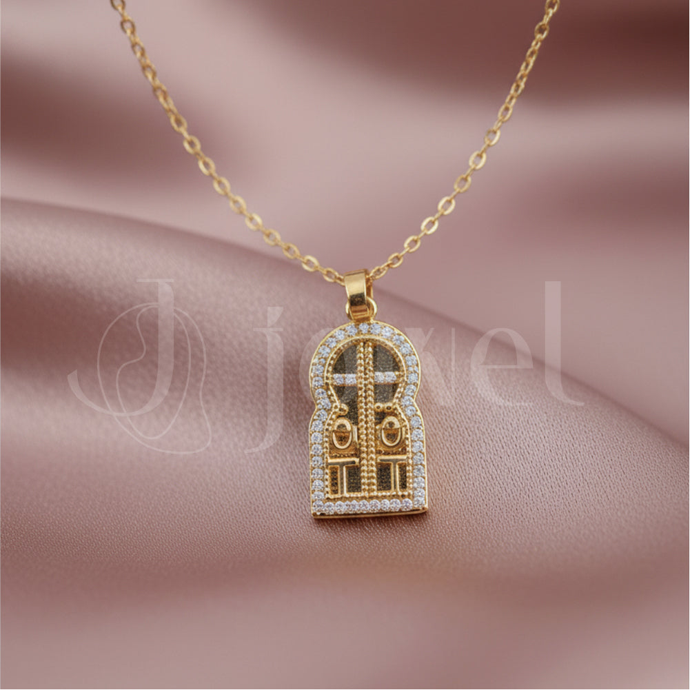 Collier Pendentif Porte Marocaine Dorée et Cristaux | Jowel.ma Portez un fragment de l'âme du Maroc avec notre collier exceptionnel. Ce pendentif doré, finement ciselé et pavé de cristaux scintillants, recrée la beauté d'une porte traditionnelle de la médina de...