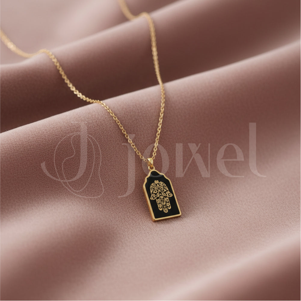 Portez un symbole de protection et de bénédiction avec notre collier Khmissa. Ce bijou élégant présente la Main de Fatima, finement dessinée en or sur un fond noir intense. Plus qu'un simple accessoire, c'est un talisman moderne qui allie tradition et style minimaliste. Une amulette précieuse pour vous accompagner chaque jour, par Jowel.ma.