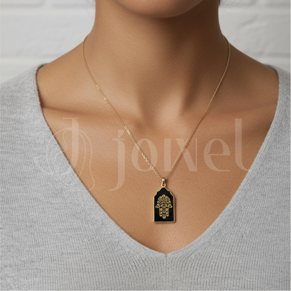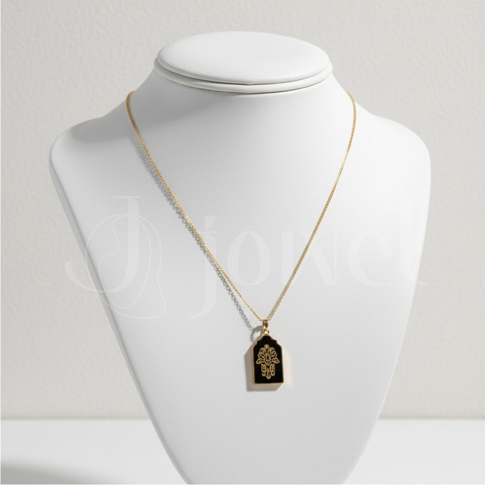 Collier Khmissa Protecteur - Main de Fatima Doré et Noir | Jowel.ma Portez un symbole de protection et de bénédiction avec notre collier Khmissa. Ce bijou élégant présente la Main de Fatima, finement dessinée en or sur un fond noir...