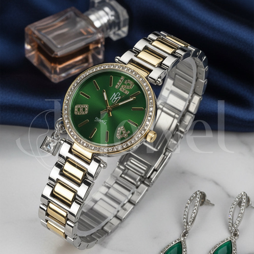 Montre Femme Bimétal avec Cadran Vert Émeraude et Cristaux | Jowel.ma