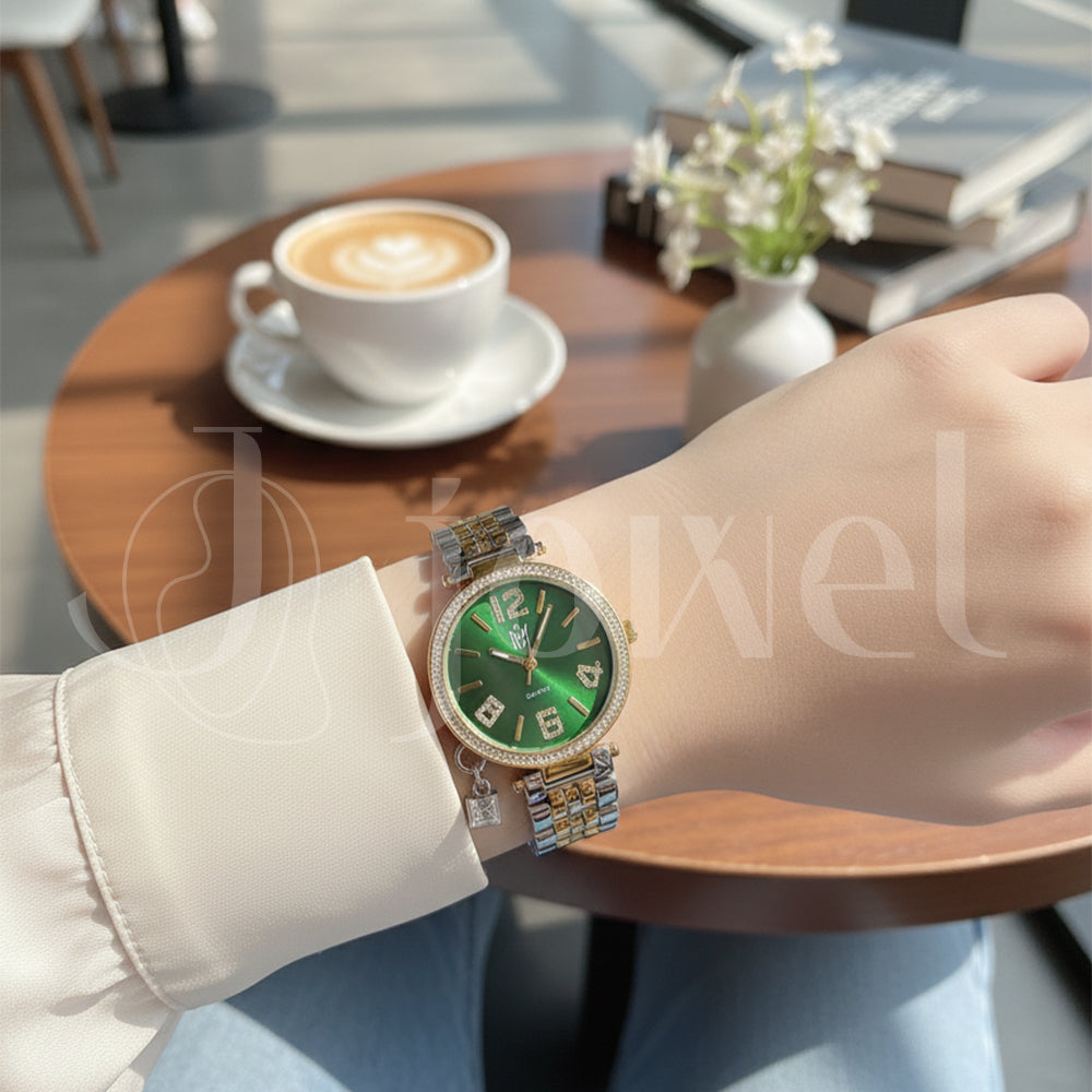 Montre Femme Bimétal avec Cadran Vert Émeraude et Cristaux | Jowel.ma Captivez tous les regards avec notre nouvelle montre au cadran vert émeraude. Son design bimétal est magnifié par une lunette sertie de cristaux et des index scintillants. Touche finale...