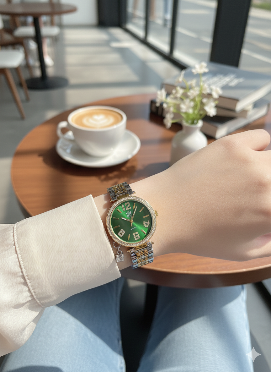Captivez tous les regards avec notre nouvelle montre au cadran vert émeraude. Son design bimétal est magnifié par une lunette sertie de cristaux et des index scintillants. Touche finale de préciosité, un délicat charme en cristal danse à votre poignet. C'est une montre-bijou audacieuse et pleine de caractère, pour une femme qui n'a pas peur de briller. L'élégance vibrante, par Jowel.ma.