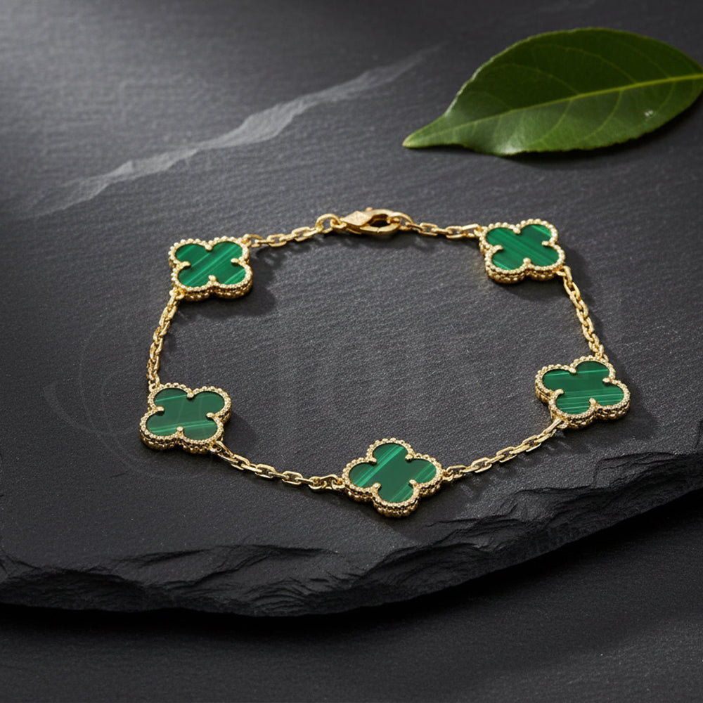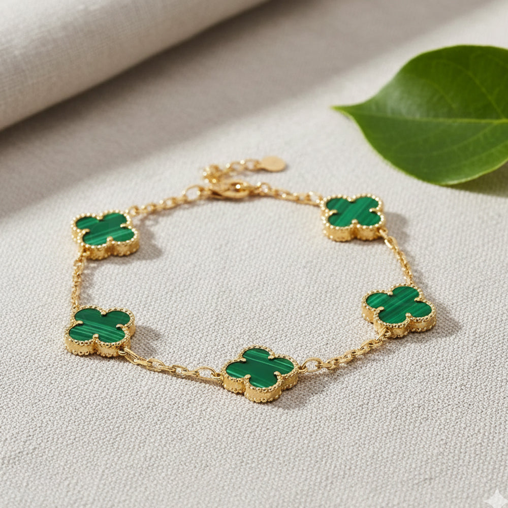 Emportez la chance avec vous grâce à ce bracelet d'une finesse intemporelle. Plusieurs motifs de trèfle en pierre malachite verte sont délicatement disposés sur une chaîne dorée. C'est l'expression la plus classique du bijou porte-bonheur, un essentiel qui ajoute une touche de couleur et d'élégance discrète à votre poignet. Par Jowel.ma.