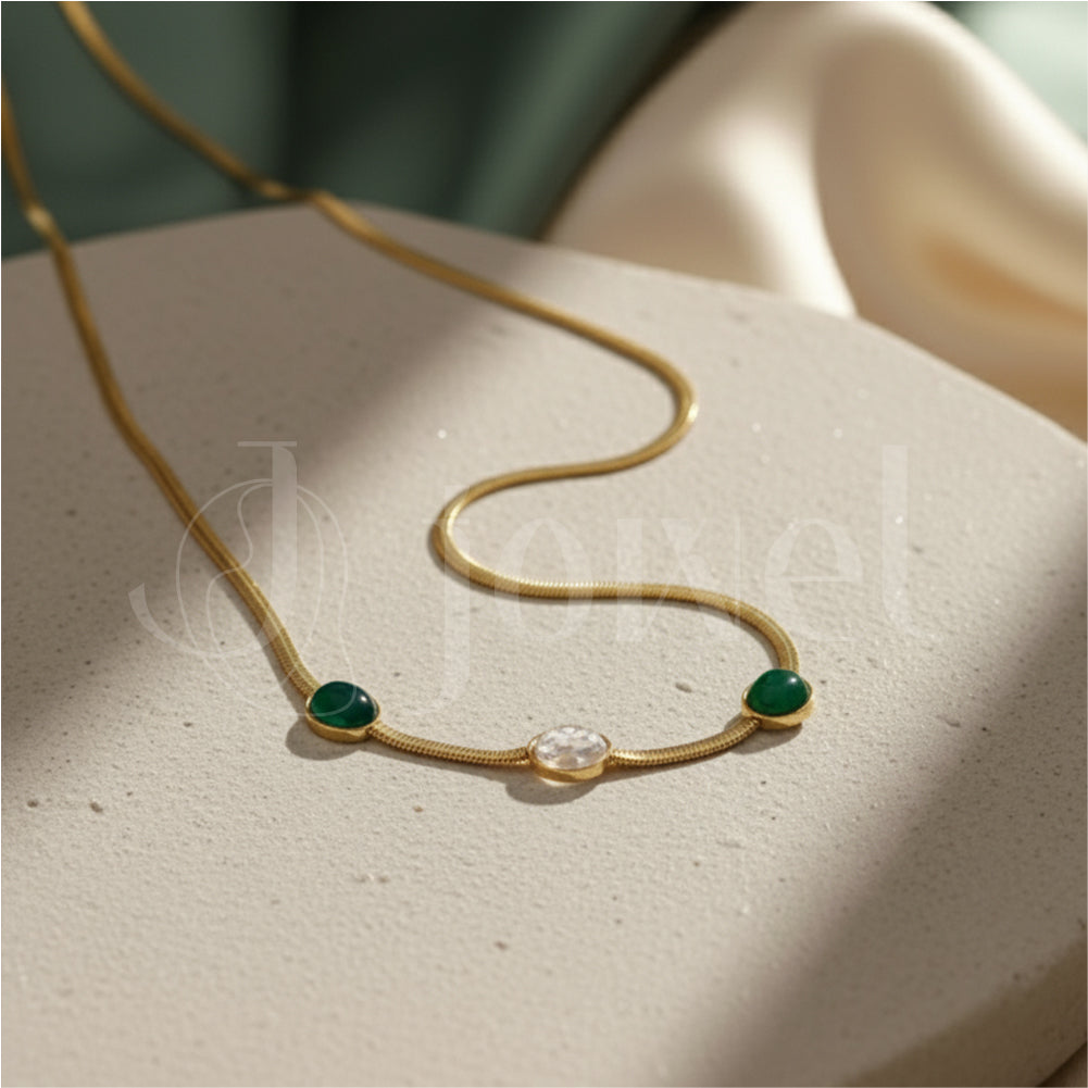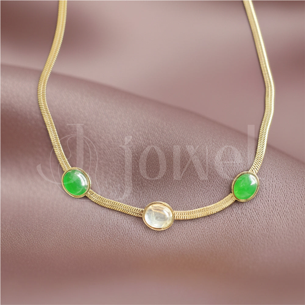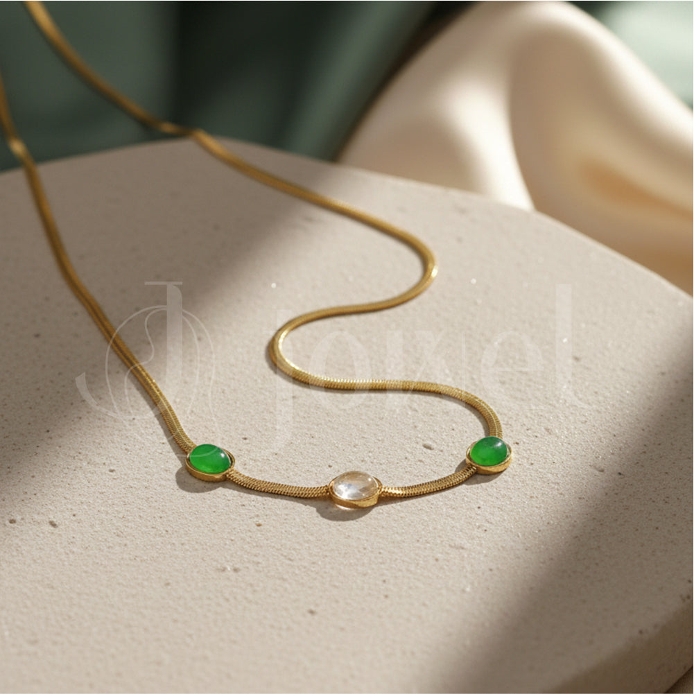 Collier Chaîne Serpent Dorée et Trio de Pierres Fines | Jowel.ma Laissez-vous charmer par l'élégance de notre collier à maille serpent plate. Délicatement doré, il est orné d'un trio harmonieux de pierres cabochons — deux vertes intenses et une quartz...