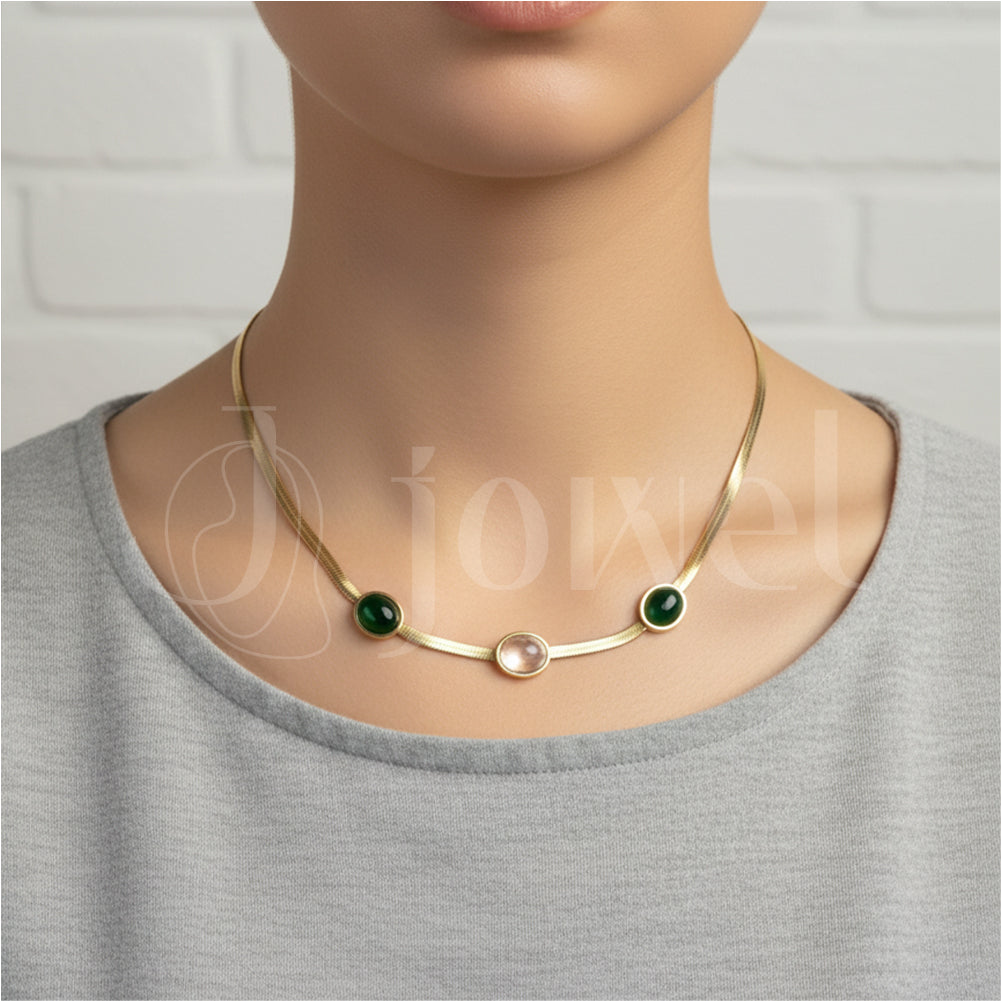 Laissez-vous charmer par l'élégance de notre collier à maille serpent plate. Délicatement doré, il est orné d'un trio harmonieux de pierres cabochons — deux vertes intenses et une quartz rose translucide. C'est le bijou parfait pour ajouter une touche de couleur et de raffinement à votre quotidien. Une création unique signée Jowel.ma.