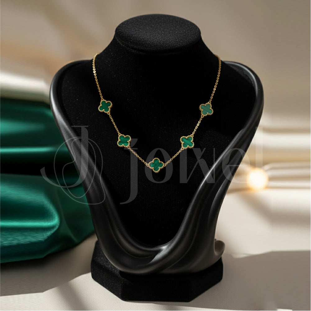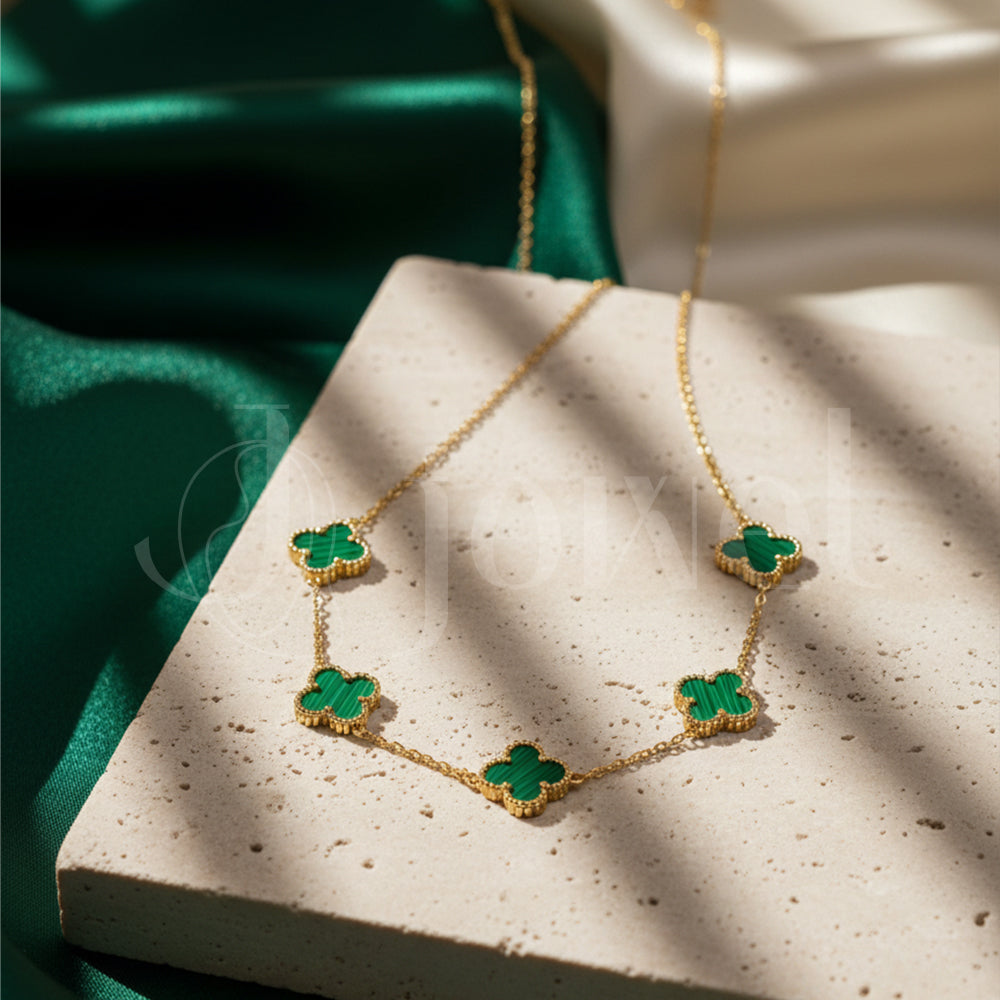 Collier à Trèfles Porte-Bonheur en Pierre Malachite Verte | Jowel.ma Invitez la chance dans votre quotidien avec notre collier à trèfles signature. Cinq motifs de trèfle à quatre feuilles, ornés de pierre malachite d'un vert intense, ponctuent une délicate chaîne...