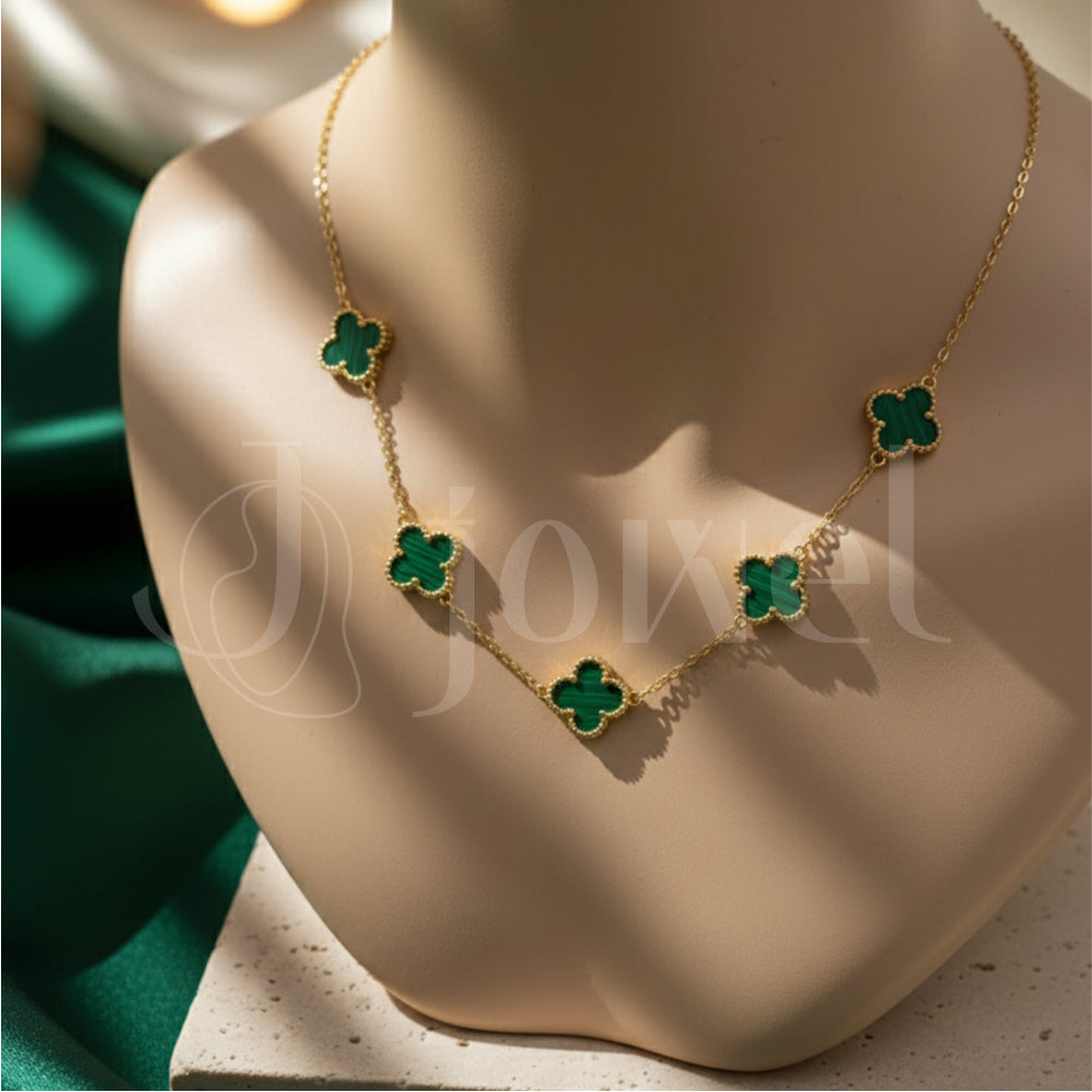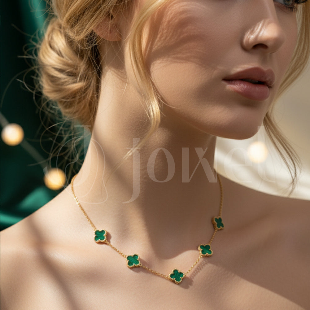 Invitez la chance dans votre quotidien avec notre collier à trèfles signature. Cinq motifs de trèfle à quatre feuilles, ornés de pierre malachite d'un vert intense, ponctuent une délicate chaîne dorée. Chaque motif est finement bordé, ajoutant une touche de raffinement. C'est le bijou porte-bonheur par excellence, un symbole intemporel d'élégance et de bonne fortune. Par Jowel.ma.